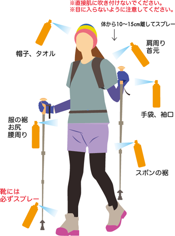また地面にしゃがんで作業をする場合は、お尻や腰周りにもスプレーしましょう。